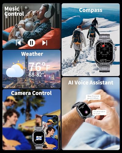 【AI Voice Control & Compass & Practical Functions】PODOEIL smartwatch features an AI voice assistant for easy control with voice commands, allowing you to effortlessly make calls, check the weather, and play music. In 2024, we added a compass for precise navigation during outdoor adventures. Additionally, the smartwatch offers practical functions such as alarms, calculators, drinking reminders, and a find phone feature. Whether for daily life or outdoor activities, our smartwatch provides convenience and practicality to meet your needs.