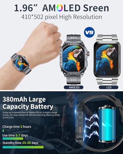 【Newly Upgraded AMOLED Screen】① Outdoor Visibility: PODOEIL smartwatch is equipped with a 1.96” HD AMOLED full touchscreen, delivering vivid and colorful visibility even under bright sunlight. ② Always On Display: You no longer need to lift your wrist or touch the screen to check the time as the display screen never sleeps.③ Energy Efficiency: AMOLED screens are more energy-efficient and can save up to 40% power compared to LCD screens.