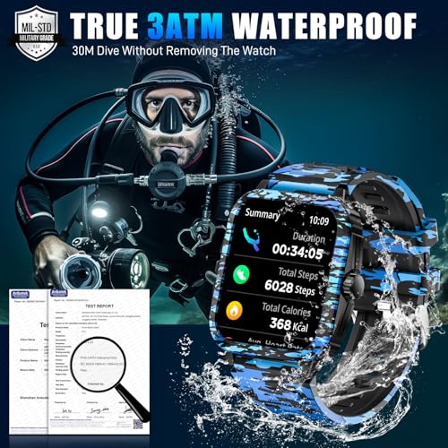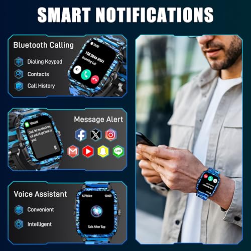[More Useful Functions]: Waterproof smartwatch not only has Bluetooth call function, but also has voice assistant, weather push, stopwatch, timer, stopwatch, calculator, camera remote control, music control, find mobile phone and other practical functions to make your life more convenient and efficient. The simple and lightweight design of rugged smart watch is suitable for wearing on various occasions, making it ideal for birthday and Christmas gifts.