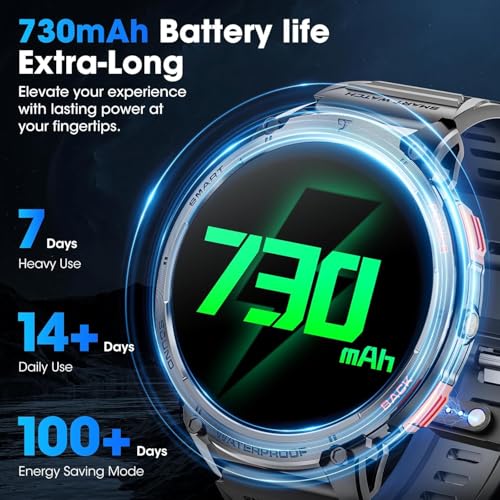 【730mAh Large Battery Capacity】Tactical smart watches for men has 730mah battery twice as much as that of conventional smartwatches. a super power-saving AI algorithm breaking the industry is adopted to minimize power consumption, and can continue to use sports mode.The smartwatch takes 3 hours to charge and the battery life on a full charge typically lasts 7-10 days depending on how much you use the watch.