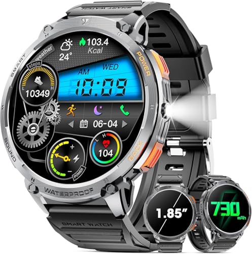 Military Smart Watch for Men 1.85″ HD Touch Screen 730mAh Battery Smart Watches with LED Flashlight for Android iOS (Bluetooth Call Answer/Dial Calls) Fitness Tracker