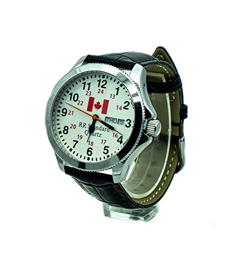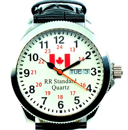 North American Railroad Approved Swiss Movement Ronda 517 Date/Calendar Wrist Watch 24 Hour Analog Dial Face Stainless Steel Silver Case Canadian Flag