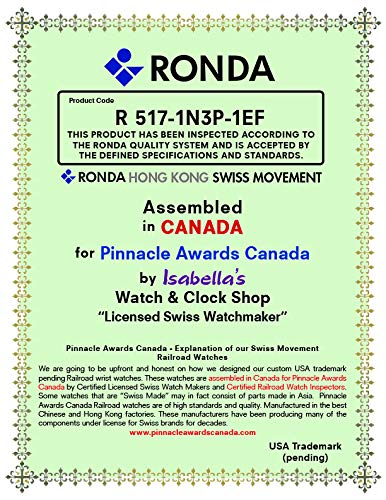 Pinnacle Awards Canada – Explanation of our Swiss Movement Railroad Watches – We are going to be upfront and honest how we designed and produced our CUSTOM, U.S.A. trademark pending Railroad wrist watches.These watches are ” Assembled in Canada ” for Pinnacle Awards Canada by Certified Licensed Swiss Watch Makers and Certified Railroad Watch inspectors .Some watches that are ” Swiss Made” may in FACT consist of parts made in Asia.Pinnacle Awards Canada Railroad Watches are of HIGH standards and quality.The stainless steel watch case is manufactured by one of the best Chinese watch manufactures,The Ronda 517 movement is produced in Hong Kong by a ” Licensed Ronda Manufacture”. These manufactures have been producing many of the watch components under license for Swiss and other brand names for decades. www.pinnacleawardscanada.com