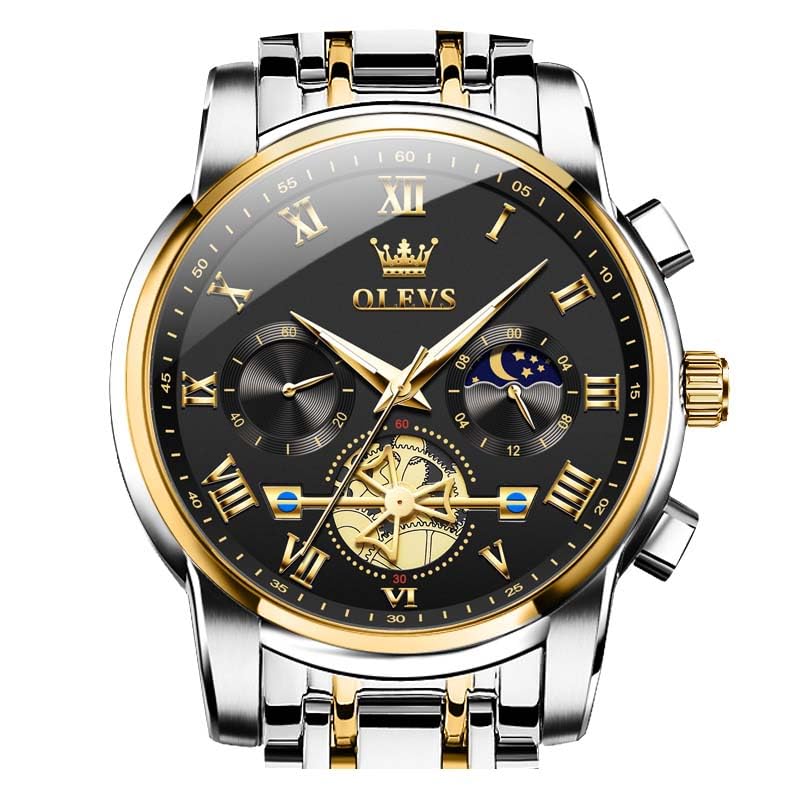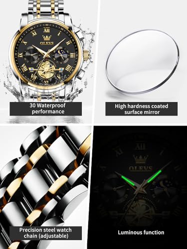 OLEVS Men’s Stainless Steel Chronograph Watch, Big Face Multi Dial Waterproof Luminous Analog Quartz Watch, Luxury Date Diamond Classic Men Wrist Watch (Gold/Silver/Black/Blue)