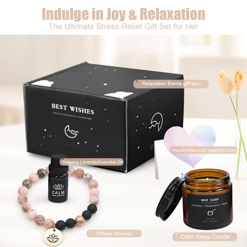 Woman Gift Set Includes: Thoughtful relaxation gift for her featuring an Aromatherapy Lava Stone Bracelet, pure Lavender Essential Oil, Lavender & Chamomile Scented Candle, elegant Greeting Card, and premium Gift Box for any special occasion