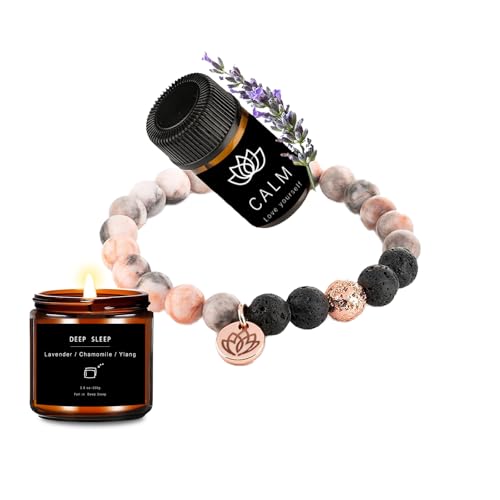 Relaxation Gifts for Women – Aromatherapy Bracelet & Lavender Candle Gift Set – Anxiety & Stress Relief Birthday Gifts for Mom, Sister, Friend (Pink Lotus)