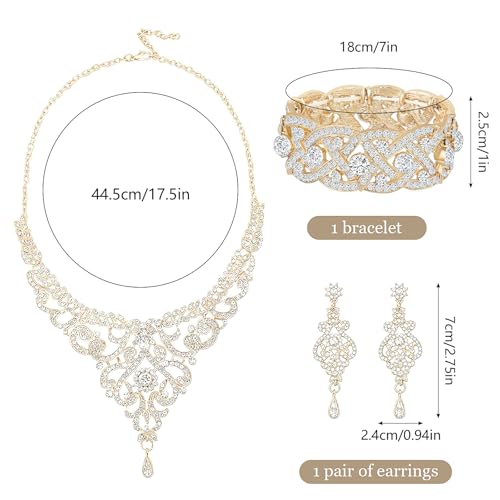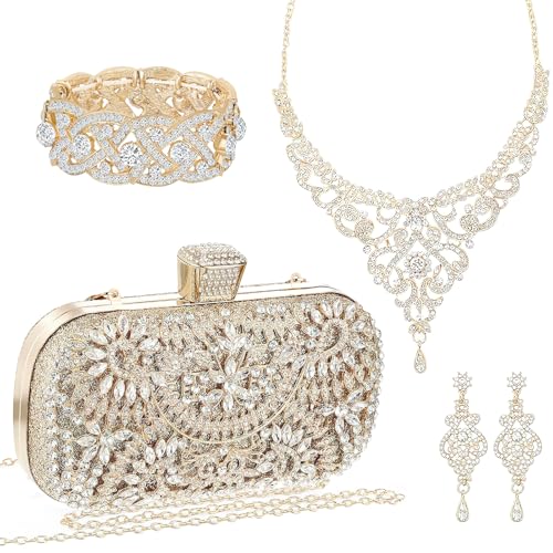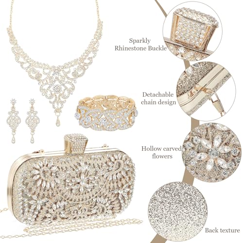 4 Pcs Rhinestone Jewelry Set Clutch Evening Bag Elegant Crystal Necklace Dangle Earrings Bracelet Wedding Party Bridal Accessories for Women