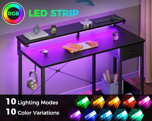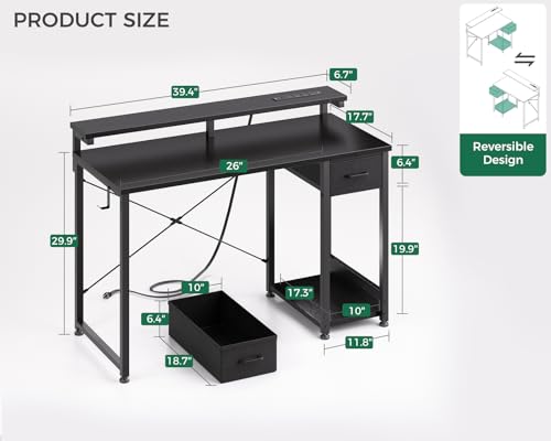 AODK Gaming Desk, Pc Desk with Adjustable Monitor Shelf, 40 Inch Computer Desk with Drawer, Reversible Gamer Desk with LED Lights & Power Outlet, Work Desk with Headphone Hook for Home Office, Black