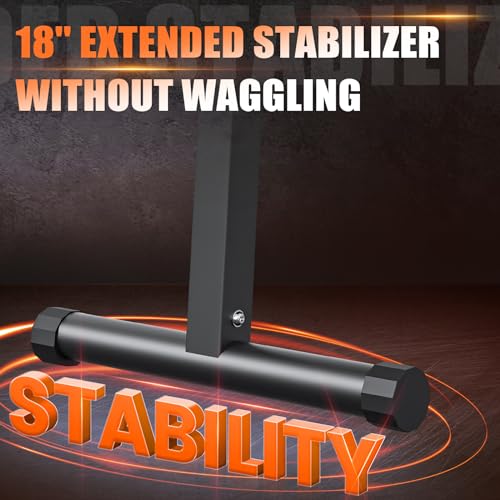 【Excellent Base Stability】This flat bench is equipped with an extended stabilizer measuring 18 inches, featuring anti-slip foot caps and reinforced bolts. This provides the incline bench with robust stability, preventing any wobbling or side-to-side movement during exercise. The standard seat height of 17 inches ensures that your feet are flat on the floor, maintaining a stable center of gravity, regardless of the exercise position.