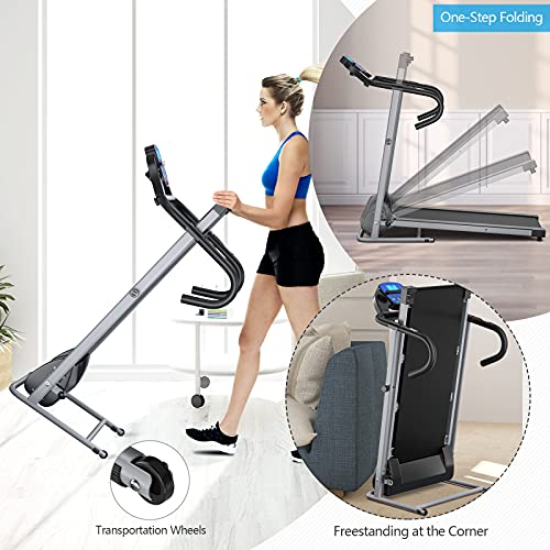 【Easy Storage & Space Saving】The folding treadmill can be folded vertically at 90° degrees and placed against wall or freestanding at corner. The compact footprint is very suitable for small apartments. And the fast folding design with convenient transportation wheels make the treadmill move around without hassle.