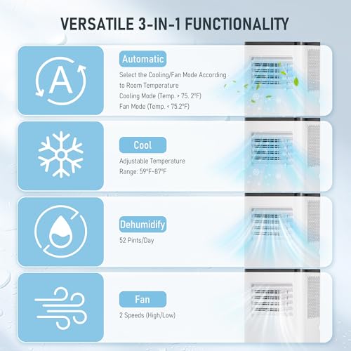 3-in-1 Powerful Air Conditioner: Experience cooling, dehumidifying (51 pints/day), and fan functions all in one portable AC unit. It can not only cool down your room, but also reduce humidity and promote ventilation. It is suitable for various occasions, such as the living room, bedroom, study, office, and more