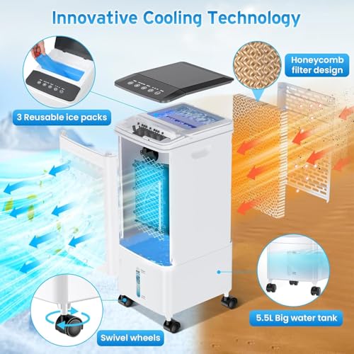Large 5.5L Tank for Long-Lasting Use: The 1.5-gallon tank runs up to 16 hours per fill. Top-fill design with visible water levels makes refills easy—no bending. You can add the ice packs to give you a double cool experience in summer