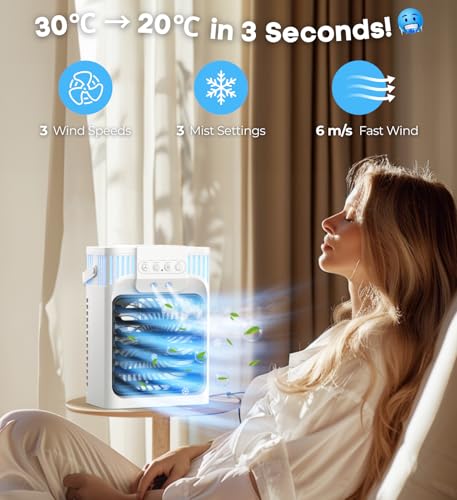 【GET CHILLED IN A FLASH FROM 30℃ → 20℃!】 Our portable air conditioner for bedroom delivers a powerful chill! Personalize your cooling journey with 3-speed modes (Natural/Med/High) and 3 mist settings (Natural/Low Cool Mist/High Cool Mist). Boasting dual atomizers and cutting-edge triple refrigeration tech, our air conditioner portable creates a revitalizing cooling mist in the blink of an eye. Join over 300,000 satisfied customers who enjoyed refreshing coolness all summer long! This air conditioner portable will make you wonder why you didn’t find it earlier!