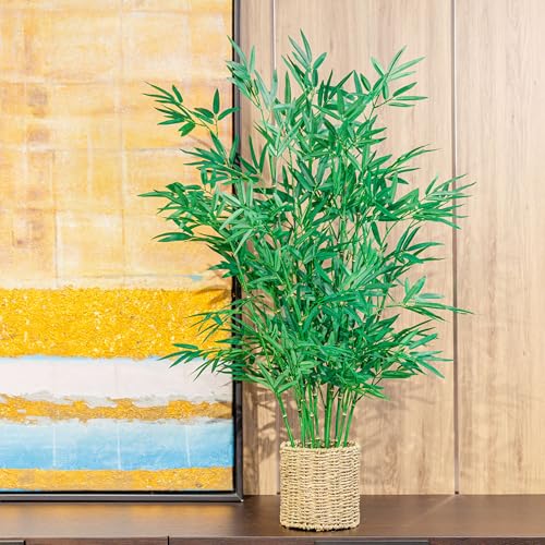 Introducing the exquisite 3.2ft Artificial Bamboo Tree by 365 Blooming Decor, an unparalleled choice for those seeking to elevate their living spaces with the timeless beauty of nature, without the maintenance demands of live plants. This Bamboo Silk Tree stands out as a meticulously crafted faux tree, featuring 13 realistic bamboo trunks that provide a lush, verdant appearance, making it a versatile addition to your home decor. Housed in a luxury handmade seagrass pot, this artificial bamboo tree seamlessly integrates into various decor styles, whether it be a modern living room, a serene bedroom, or a sophisticated office space. Its lifelike appearance is achieved through high-quality silk elements, ensuring that every leaf and trunk mimics the natural beauty of a live bamboo plant. This fake bamboo tree is not only a testament to the art of faux plants but also a practical solution for those who prefer low-maintenance room decor. Ideal for both indoor and outdoor use, this artificial bamboo tree serves as a stunning piece of home decor. Whether you’re looking to enhance your living room decor, create a tranquil bedroom atmosphere, or add a touch of greenery to your office decor, this faux tree fits seamlessly. It can also function as an elegant privacy screen for your outdoor patio or as a chic addition to your kitchen decor. The 3.2ft height makes it a perfect candidate for a plant stand indoor or as a standalone piece in your indoor garden. Its versatility extends to various decorating styles, including boho decor, modern minimalist, and traditional themes. The seagrass pot adds a rustic touch, making it suitable for both contemporary and classic settings. This artificial bamboo tree is not just a decorative item but a multifaceted piece that complements various elements of your home decor. It can also be paired with other faux trees indoor, such as a faux olive tree or a faux palm tree, to create a cohesive indoor plant ensemble. For those who prefer larger arrangements, consider pairing it with tall artificial plants indoor like a ficus tree or an artificial dracaena tree. In summary, the 3.2ft Artificial Bamboo Tree by 365 Blooming Decor is a blend of elegance and practicality, making it an ideal choice for anyone looking to enhance their home or office environment with the natural beauty of a bamboo tree. Its high-quality construction ensures durability, while its lifelike appearance guarantees that it will be a cherished part of your decor for years to come.