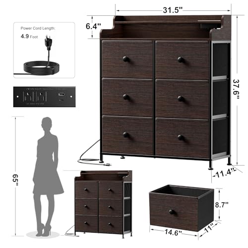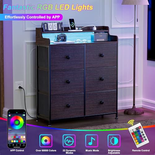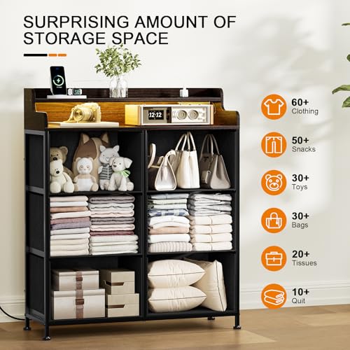 REAHOME Dresser for Bedroom with Charging Station and LED Lights, 6 Drawers Dresser TV Stand with Wooden Top, Tall Fabric Chest of Drawer, Sturdy Frame for Closet, Living Room, Hallway, Brown