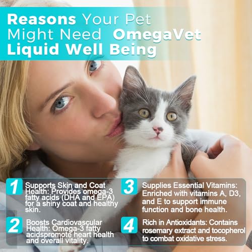 OmegaVet Liquid is a premium pet supplement with omega-3 fatty acids (DHA & EPA), vitamins A, D, E, and antioxidants. Fish oil-based and bacon-flavored, it supports your pet’s health and enhances palatability.