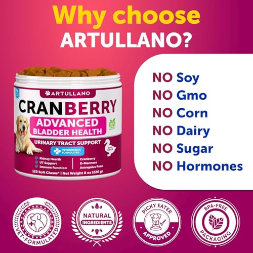 Comprehensive Bladder Control for Dogs: These cranberry chews offer exceptional bladder support for dogs, helping to maintain healthy kidney and urinary tract function while reducing the likelihood of recurring infections.