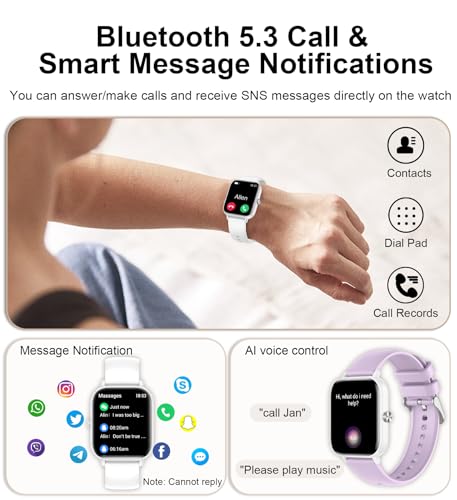 【Calling & Message Alerts & AI Voice Assistant】 With Bluetooth connection, you can answer/make calls on the smartwatch anytime, anywhere. It also supports information reminders (text, Facebook, WhatsApp, Instagram, Twitter, etc.) Read at any time on your wrist so that you will not miss important message notifications. (Note: Cannot reply). The smartwatch for women can also operate the phone’s AI voice assistant, such as Sir Assistant.